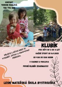 Zveme Vás s dětmi na zápis do Lesní mateřské školy Bystrouška, který se uskuteční dne 16. 5. 2025 od 13:30 do 15 hodin v zázemí školky.